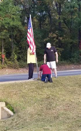 A dedicated group of Rotarians mount flags on 10' aluminum poles and place iron mounts in the ground. The flags are stored at the Longview News Journal and are loaded by teams and put in the ground mounts for the designated holiday. Teams pick up the flags after the holiday and return them for storage.